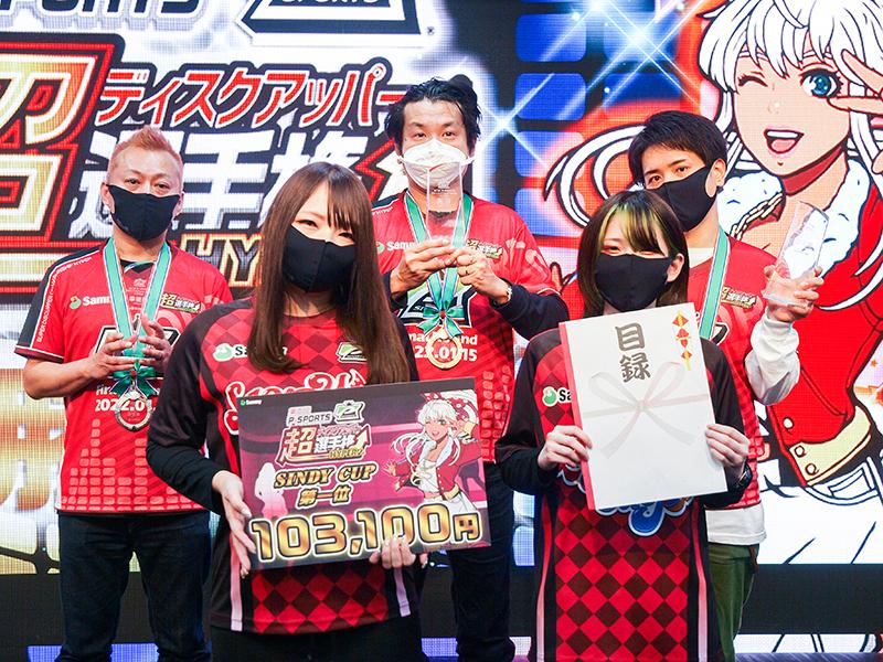 大会の合間には、地区予選に参加した女性対象のSINDY CUPも行われた。地区予選での成績が全国上位だった女性5人が参加。決勝戦同様の戦いが繰り広げられ、名古屋予選から参加したきゃろさん(3万2900pt)が優勝した。2位は大阪予選からのりんえるさん(2万6150pt)。エンターテイメントオメガの屋号でホールを展開する第一物産(京都市)のazzさんも健闘した。