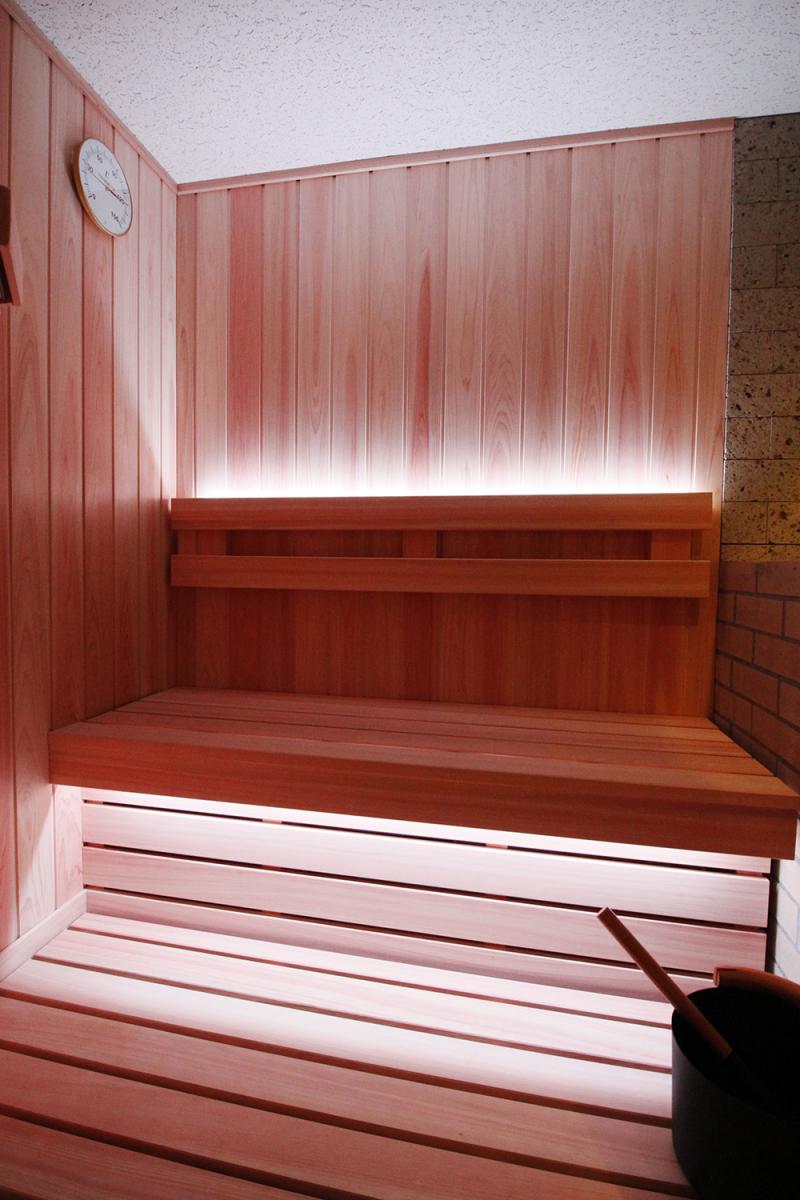 トレーニング後の体を癒す個室のサウナルームには、水シャワーまたは水風呂を完備。サウナルーム内から視聴できるテレビや、火照った体を休ませるリクライニングチェアも用意している。
