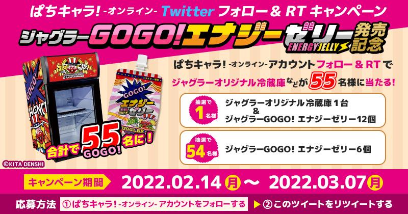 Twitterキャンペーンでは、同社の公式Twitterをフォローしてキャンペーンツイートをリツイートした人から抽選で「ジャグラーオリジナル冷蔵庫」1台+「ジャグラーGOGO!エナジーゼリー」12個などを55人にプレゼント。期間は3月7日まで。