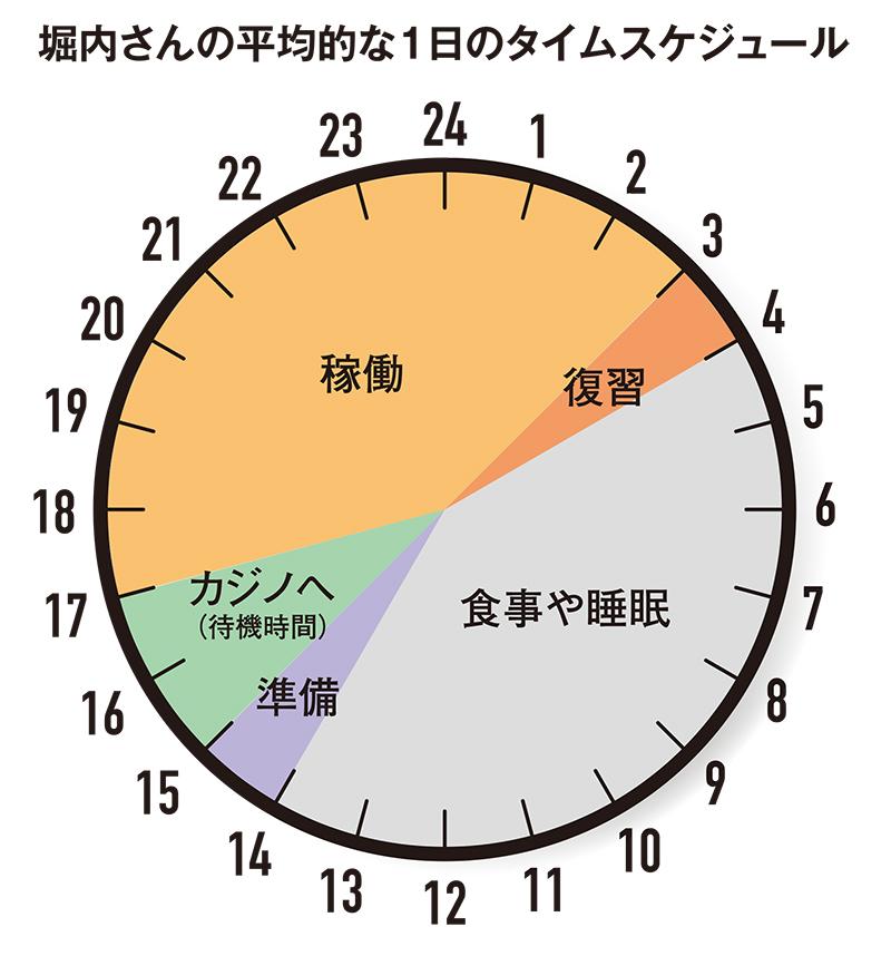 堀内 マカオは世界のカジノの中でも、ミニマムレートが高いんです。ハンド(ゲーム)に1回参加するときの最低チップは50香港ドル/100香港ドル。日本円でだいたい700円/1400円です。ラスベガスは1ドル/2ドルですからざっくり100円/200円。7倍違います。レートが安いと勝っても低額なので効率が悪いんですよ。僕は基本的に50/100と100/200のレートを打ち分けていました。1日のプレイ時間はだいたい8時間から10時間。月に200時間の稼働を最低限のラインにしていました。懐に余裕がある人が“お遊び”で来ているときなど、テーブルの状況が良いときは、20時間打ち続けることもありました。日が変わればいつもどおり、10人席のうち7~8人がプロというシビアな状況に戻りますからね。集中力が続く限り、期待値が高い今の状況を優先していました。