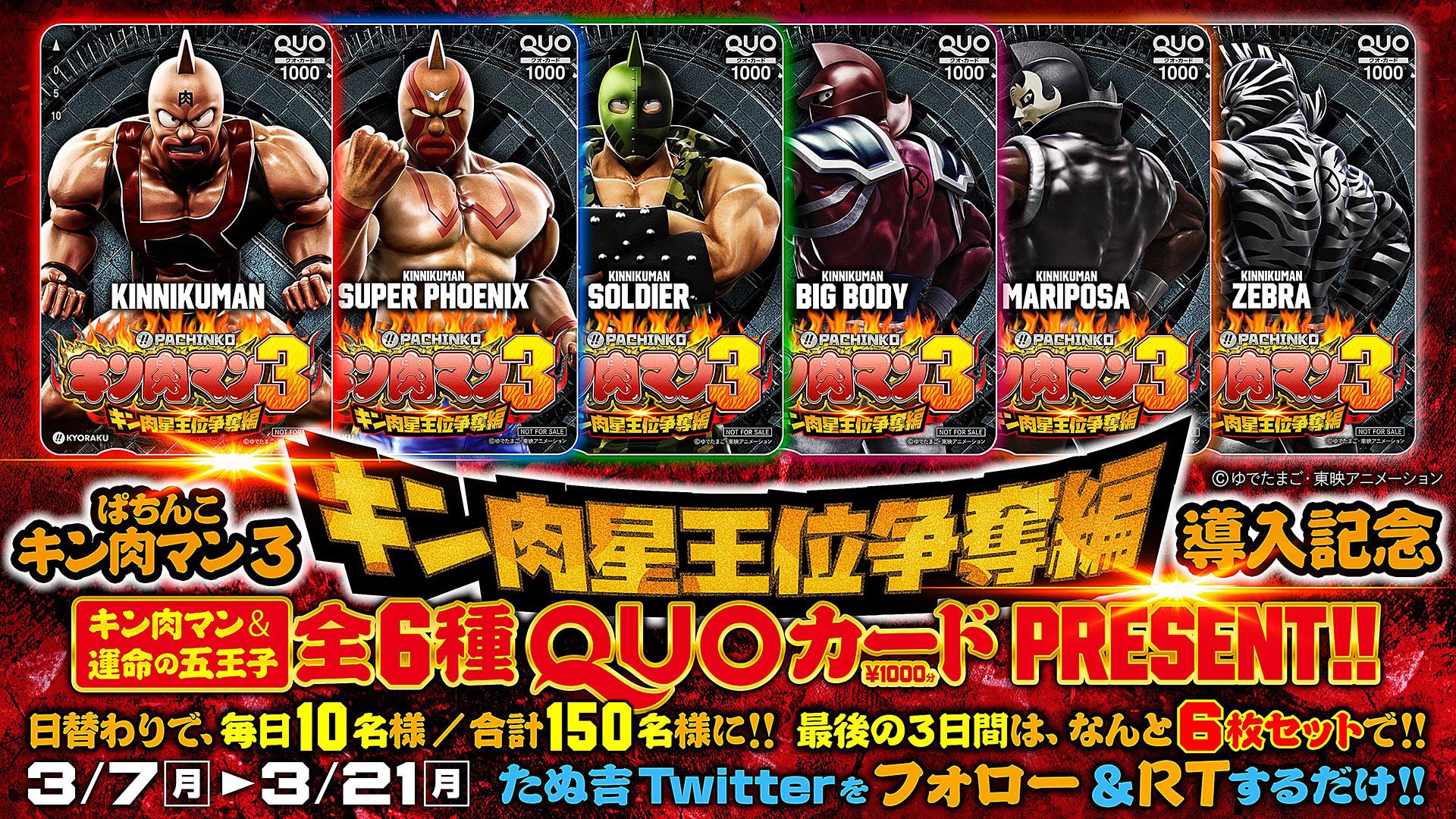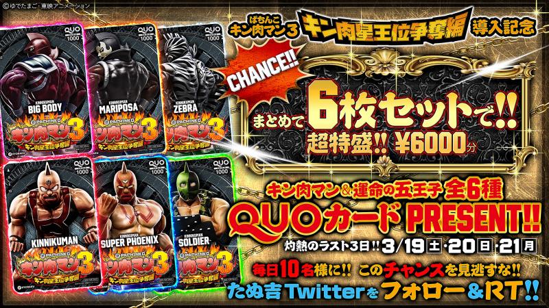 QUOカードの絵柄はキン肉マンと運命の五王子の全6種。3月18日までは日替わりで、1枚1000円分のカードが毎日10人に当たる。翌19日から最終日(3月21日)までの3日間は、全6種をセットにして各日10人にプレゼント。合計150人に当選チャンスがある。