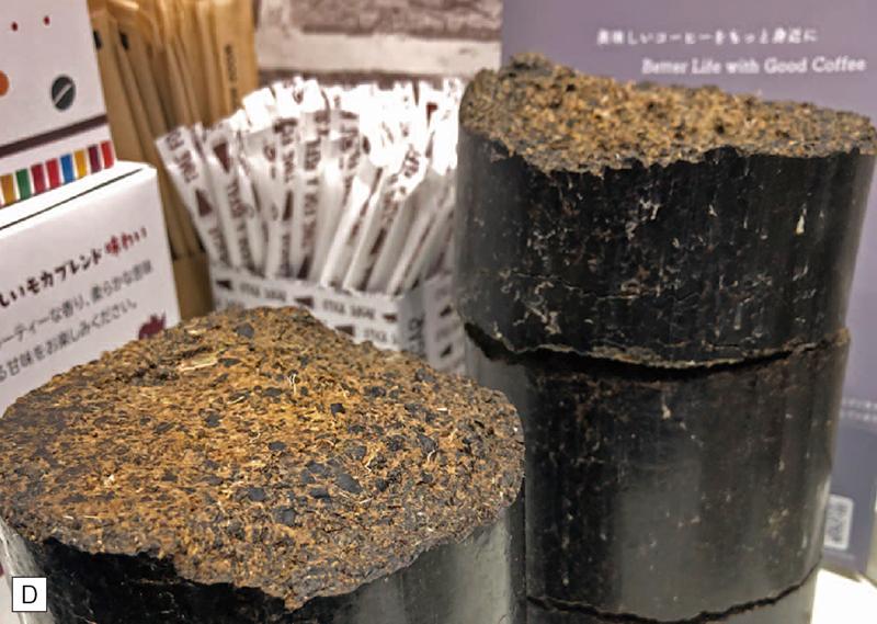 近畿大学(大阪府)と石光商事(兵庫県)は、コーヒー抽出後に出るコーヒー豆かす(写真D)から、バイオ燃料「バイオコークス」を製造し、それを燃料として焙煎した環境にやさしいコーヒーを産学連携で共同開発した。コーヒーを抽出した後に残る豆かすは、その多くが産業廃棄物として処理されている。これを原料とした固形燃料は植物由来エネルギーであるため、利用時のCO2排出量がゼロカウントとなる。同社はこの「バイオコークス」の使用を通じてコーヒー工場のCO2排出削減をめざす。