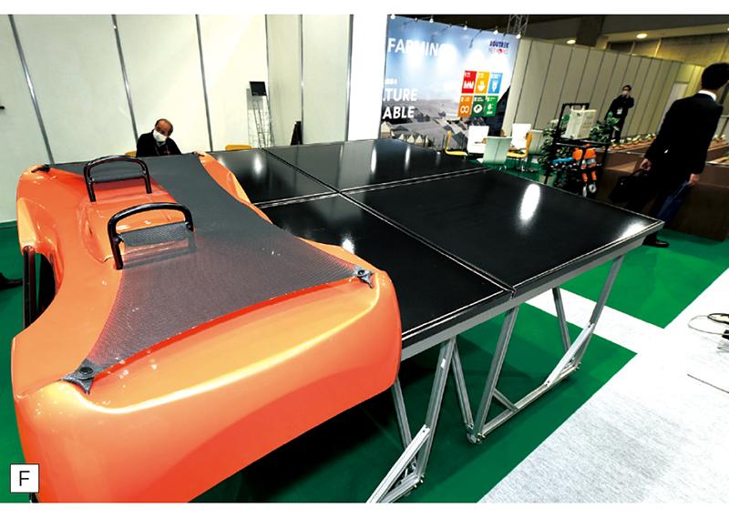 ソーラーパネルを設置して時間がたつと、汚れて発電効率が下がることがある。屋根や山の斜面など、人力での清掃が難しい場所で活躍するのが未来機械(香川県)の『ソーラーパネル清掃ロボット』(写真F)だ。リモコンで操作できる自走式、傾斜は15度まで対応。水を使って回転ブラシで洗浄する。砂漠地帯向けの水不要タイプもラインナップしている。