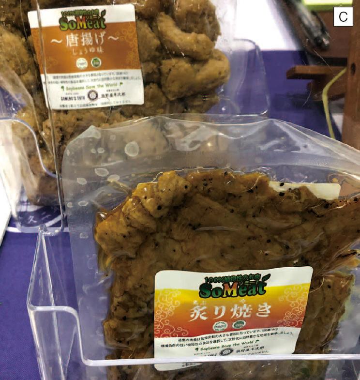 ベジタリアンやヴィーガンはもちろん、健康的な食生活を目指す人たちのために植物性の原料で作った代替肉「ソミート(SoMeat)」(写真C)を開発、出品したのは文久二年創業の老舗豆腐店、染野屋半次郎(茨城県)。動物性原料も保存料も使用しない「ソミート プラントベース ミンチ」のほか炙り焼き、しょうが焼き、唐揚げなど、味と肉の触感にこだわった代替肉商品をラインナップ。大豆を知り尽くした豆腐屋だからこそ、大豆ミートの課題である植物たんぱくの臭みを消すことができたという。大豆ミートは肉と比べ製造過程におけるCO2排出量は50%、水資源消費量は7.7%と環境負荷が非常に小さくなっている。
