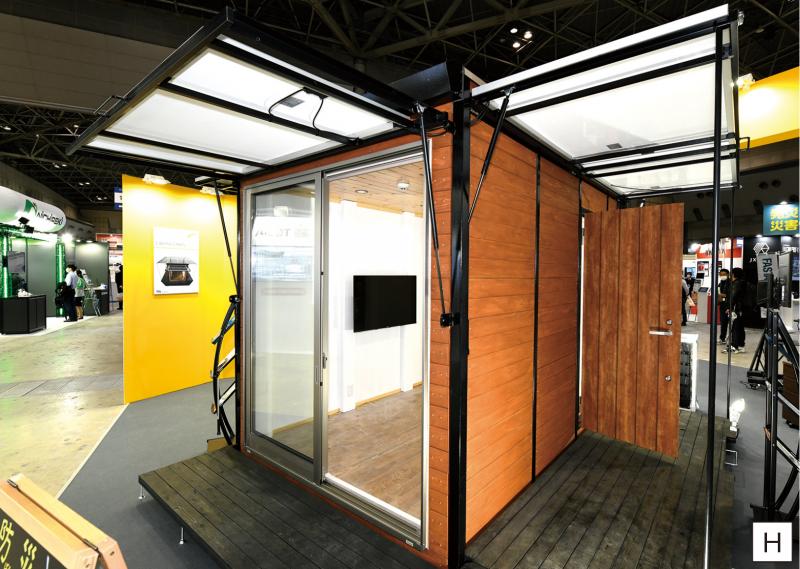 東亜工業(群馬県)の『リベラキャビン』(写真H)は、ソーラー発電専用に設計されたオフグリッドハウス。屋根上と可動式屋根を合わせるとソーラーパネルは4枚から10枚まで実装でき、約1.22~3.05kWと大容量発電を実現する。軽量で寿命の長いリチウムイオン電池を標準採用、1台~6台まで設置可能で、約2.4~14.4kWhまで蓄電できる。キャビンは1台ずつ自社工場で組み立て。災害時には蓄電池だけで1日冷蔵庫24時間+エアコン6時間+シーリングライト8時間のほか、テレビやスマホの充電に電力を使っても3日間維持できる。