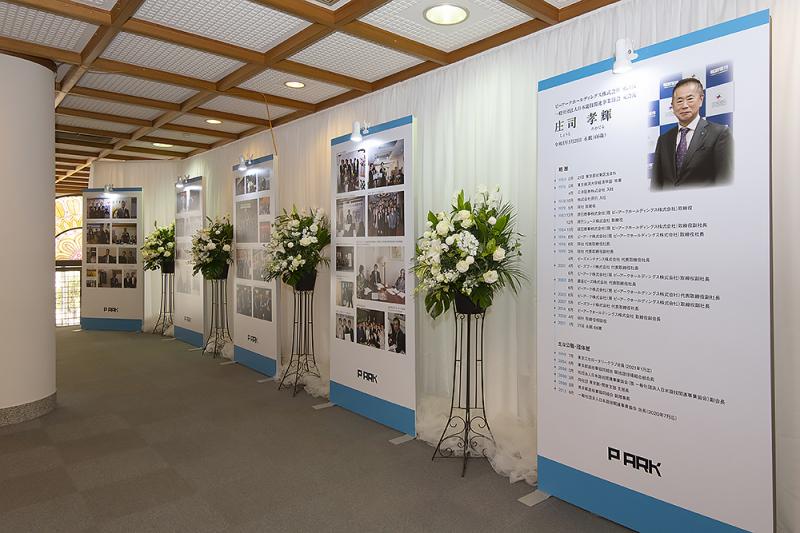 会場にはピーアーク、日遊協、ロータリークラブの活動における庄司氏の姿をおさめたパネルが展示され、参列者が足を止めて在りし日の故人を偲んでいた。