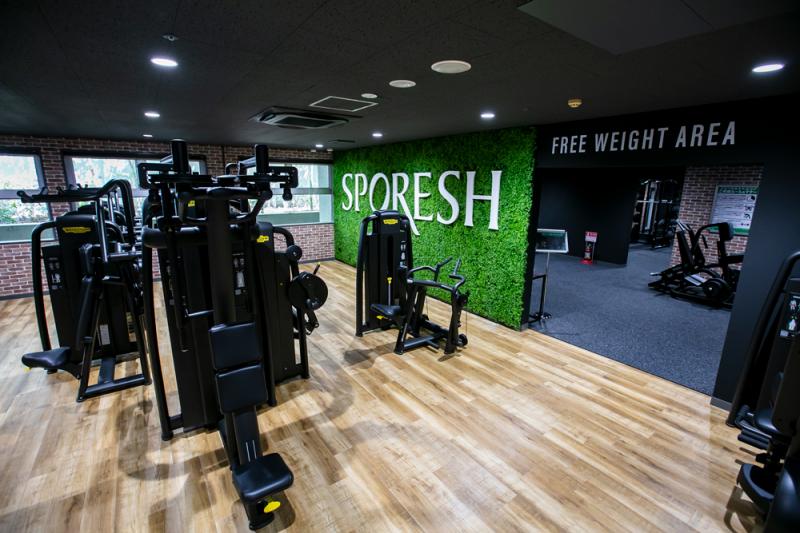 併設された「SPORESH桐生店」は同社として3店舗目の出店になる。ウエイト系や有酸素系などのマシンエリアに加えて、暗闇スタジオや女性専用のホットヨガスタジオを備えた。マシンエリアは24時間営業で、時間を選ばずトレーニングできる。