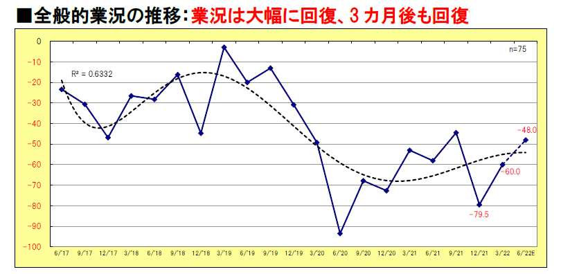 「パチンコ景気動向指数(DI)」は、業界における景気動向の判定を目的に、全国の有力ホール経営企業を対象に実施しているアンケート調査で、直近1カ月間の業況についての回答(評定尺度)のポジティブな回答の構成比からネガティブな回答の構成比を引いた値を用いている。つまり3月の「全般的業況」については、ネガティブな回答の構成比がポジティブな回答の構成比を60ポイント上回っていたことを表す。