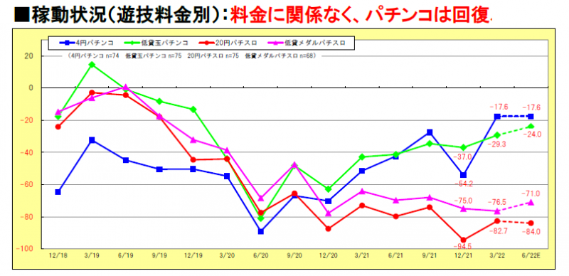 遊技機の稼働状況については、パチンコは4円貸し低貸しともに3カ月前より改善し、DI値は4円貸しがマイナス17.6p、低貸しがマイナス29.3p。パチスロは20円貸しが改善したが低貸しは横ばいで、DI値は20円貸しがマイナス82.7p、低貸しがマイナス76.5pといずれも依然として非常に低いマイナス圏にある。