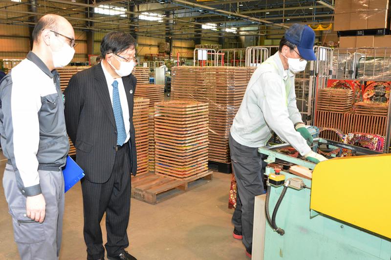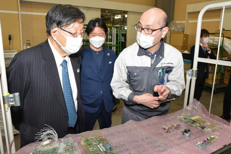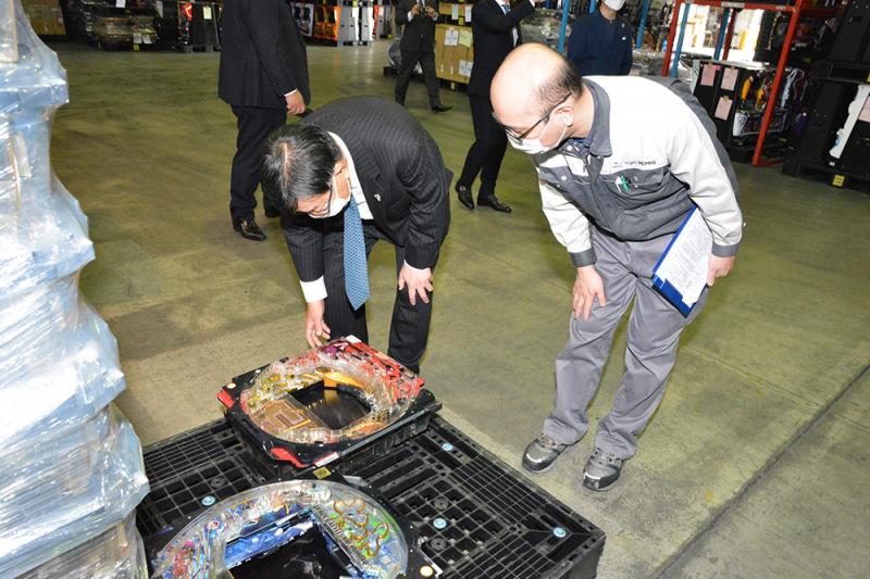 当日は工場内の研修室で遊技産業がリサイクルに取り組む背景やユーコーリプロ東日本リサイクル工場の処理能力などのレクチャーを受けた後に工場内を視察。木村氏は遊技機を手作業で解体し、取り出された部品を検品する作業など一連の工程を見学しながら、遊技機盤面の構造などについて熱心に質問。世界的な半導体不足で電子部品のリユース需要が増えていることなどの説明を受けた。