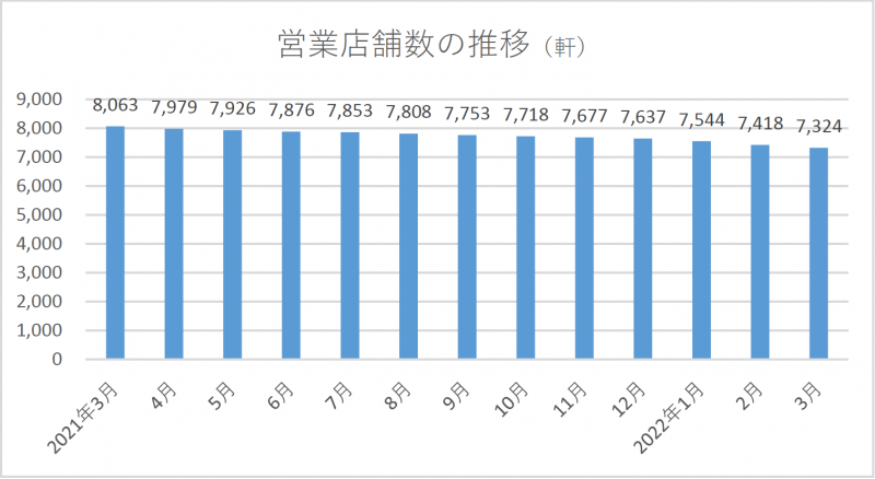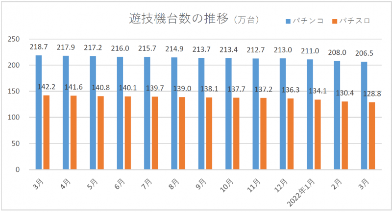 2022年04月20日No.10002761 全日遊連 加盟店舗数3月末の加盟営業店舗数は7324軒 全日本遊技事業協同組合連合会が集計した組合加盟店舗の実態調査によると、3月末時点の加盟営業店舗数は7324軒で、前月より94軒(1.3%)減少した。新規店舗数は3軒、廃業店舗数は110軒、当月中の休業店舗数は31軒。 3月末時点のパチンコ遊技機台数は206万4743台で、前月より1万5656台(0.8%)減少した。パチスロ遊技機台数は128万8127台で、同1万6184台(1.2%)減少。その他を含む遊技機総台数は335万2870台だった。