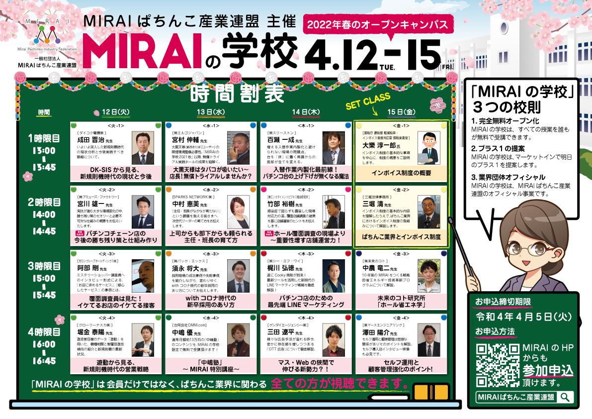 一般社団法人MIRAIぱちんこ産業連盟は4月12日から15日の4日間、同当連盟の賛助会員企業が講師として登壇するオンラインのオープンセミナー「MIRAIの学校 2022年春のオープンキャンパス」を開催した。
