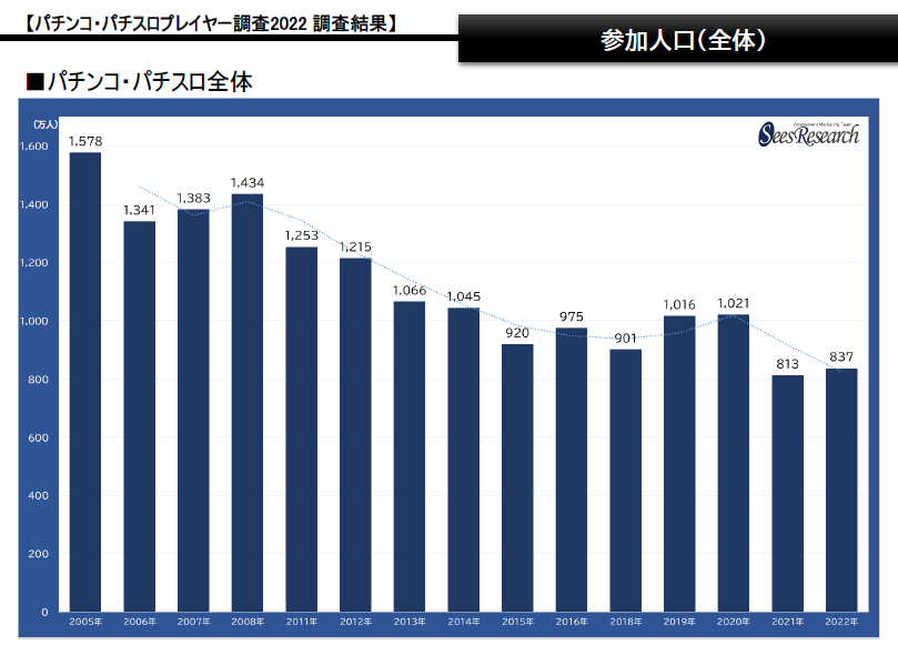 シーズは4月22日、2021年の遊技参加人口が約837万人だったと発表した。