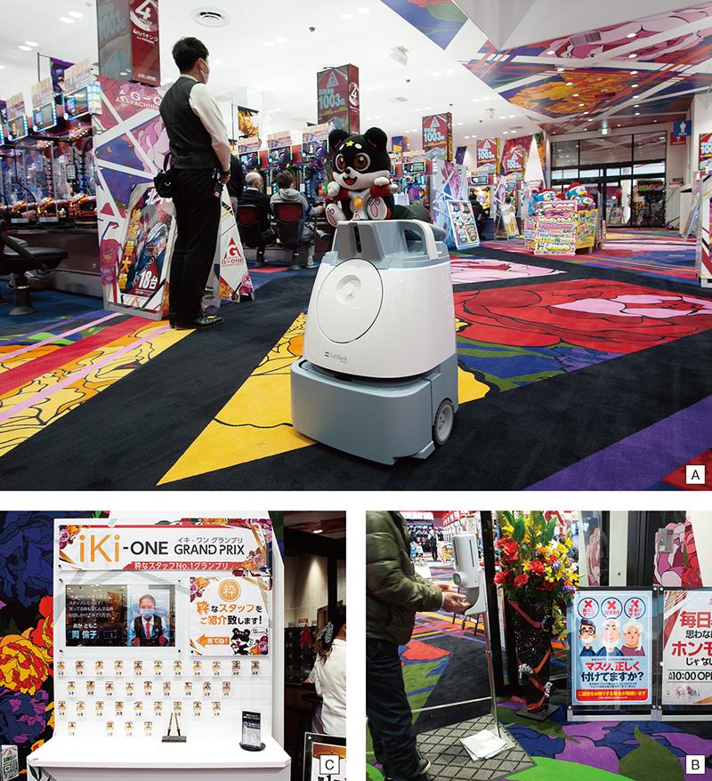 A/中央通路を自動運転で往復し床を掃除するAI除菌清掃ロボット B/入口に設置してある手指消毒器は手をかざすとセンサーが感知して自動で消毒液を噴霧。その間に自動で検温する C/印象に残ったスタッフを来店客に投票してもらう