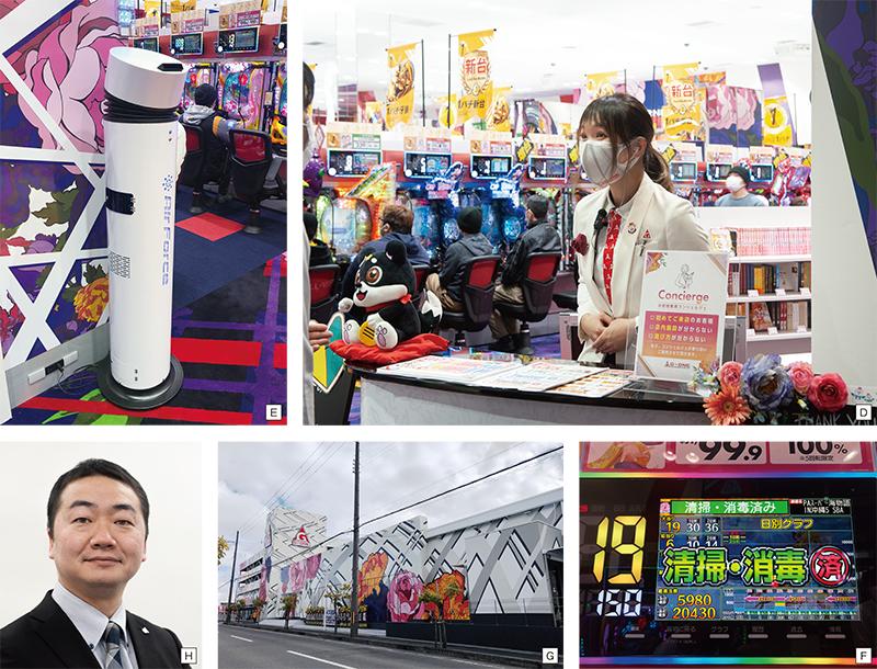 D/メイン入口の近くでコンシェルジュが迎えてくれる E/メイン入口の目の前の中央通路に設置されているドライミスト噴霧器。空間除菌により消臭する F/遊技台周りの清掃を終えるとデータ表示器を「清掃・消毒済」にするので来店客にもスタッフにもステイタスがわかりやすい G/白を基調にして鮮やかな花柄をアクセントにした外観 H/敷島直樹 店長