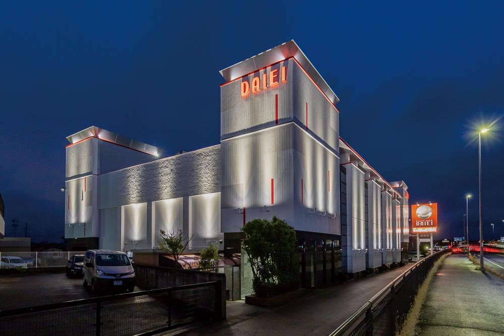 「ダイエー安積店」の工事中、新型コロナ感染症対策のロックダウンによる基盤不足から設備機器、照明器具などの遅延が発生しているなか、商社ならではの短納期可能なネットワークを使い、夜間の照明演出を最大限に引き出した。