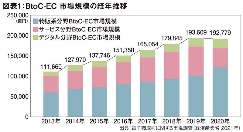 最も身近なECは、個人が企業から物やサービスを買うBtoCの形態だ。21年7月に公表された商務情報政策局の「令和2年 電子商取引に関する市場調査」によれば、日本のBtoCのEC市場規模は、19兆2779億円(図表1)。対前年比で830億円減少し、調査開始以来20年間で初めて横ばいになったという。