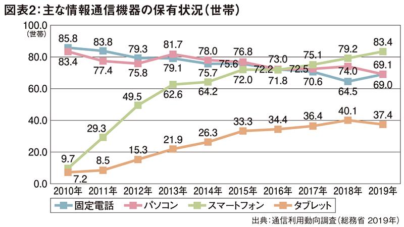 BtoCやCtoCのECがこの10年で大きく伸びた理由のひとつとして、スマートフォンの保有数の増加が挙げられる。総務省の調査(図表2)では、2010年にわずか9.7世帯だった100世帯あたりのスマホの保有世帯数は、19年に83.4世帯に増加。16年にはすでにパソコンの保有世帯数を上回っている。若年層から高齢層までスマホを操作して、ネット上で手軽に注文・決済する人が増えたことが、市場拡大の一因になっている。