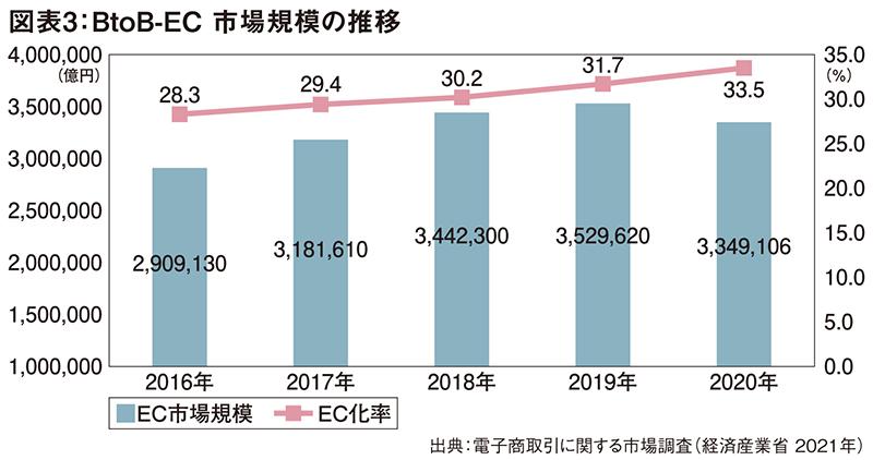 市場規模が最も大きいのが、企業間で取引を行うBtoB‐ECだ(図表3)。こちらもコロナ禍の影響などで、前年比5.1%減となったものの334兆9106億円と桁違いの数値になっている。個人向けと違い、企業間の受発注は必ずしもネット上の定型フォーマットに限らない。したがって、ECとECでない取引の境界線は曖昧で数値は推計だが、驚くほどの巨大市場になっている。