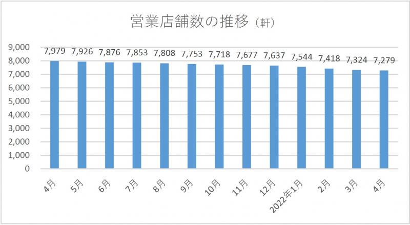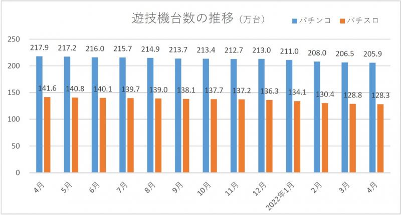 2022年05月20日No.10002810 全日遊連 加盟店舗数4月末の加盟営業店舗数は7279軒 全日本遊技事業協同組合連合会が集計した組合加盟店舗の実態調査によると、4月末時点の加盟営業店舗数は7279軒で、前月より45軒(0.6%)減少した。新規店舗数は6軒、廃業店舗数は47軒、当月中の休業店舗数は26軒。 4月末時点のパチンコ遊技機台数は205万9117台で、前月より5626台(0.3%)減少した。パチスロ遊技機台数は128万2777台で、同5350台(0.4%)減少。その他を含む遊技機総台数は334万1931台だった。