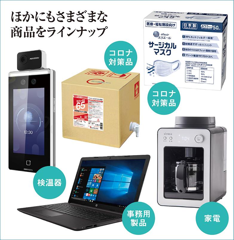 提供する商品はコロナ禍で需要が高まったペーパータオルをはじめ、トイレットペーパーやティシューペーパーなどの日用品から事務用品、衛生関連用品など。店舗や事務所で欠かせない商品をリーズナブルな価格で取り揃えている。
