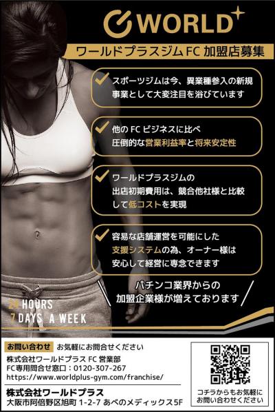 スポーツジム市場の中でも「総合スポーツジム」や「小規模サーキットジム」が伸び悩んでいるのに対し、『ワールドプラスジム』のような24Hマシン特化型ジムは順調に成長している。新規則機への入替えとコロナ禍によるダメージを抱えるホール企業にとって、安心して参入できるFCだ。乗降客の多い駅前店はもちろん、特に幹線道路沿いの郊外店はこのビジネスに最適で、成功する可能性が非常に高い。業況回復しない今、パチンコの低稼働店から『ワールドプラスジム』への転換は、現実的な選択肢と言えそうだ。