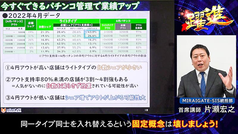 成田氏からバトンを受け取った片瀬氏は、4円パチンコの業績をさらに上げる手法について解説した。ポイントは、タイプシェアの再構築と特定日戦略の二つだ。