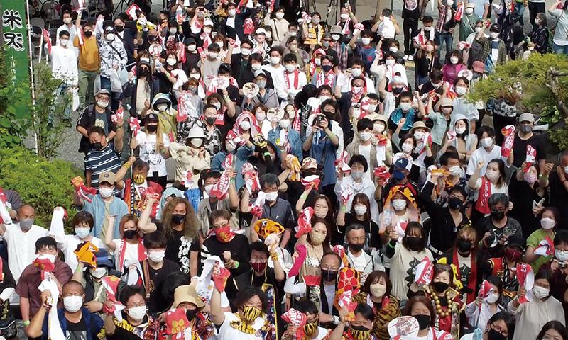 花慶ライブでは角田さんのほか、大西洋平さん、信岡愛さんが3年ぶりにファンの前で熱唱。3年ぶりの生ライブに涙ぐむファンの姿も見られた。ステージの締めくくりでは角田さんの「空へ」に合わせてドローンも飛行。参加者は感染防止対策として、声を出さずにタオルを振って3年ぶりの生ライブを楽しんでいた。