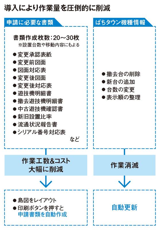 印刷ボタンを押せば、申請に必要な書類をすべて出力。さらに、これまでは新台入替のたびに更新していた『ぱちタウン』の機種情報も入替当日に自動更新してくれる。
