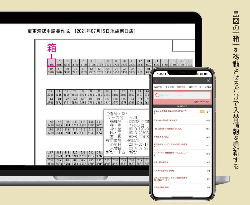 初期設定が終わり、ホール側で新台の設置場所や移動台、撤去台をサービス上の島図レイアウトに反映すると書類の準備が完了する。島図の移動方法は「台番号」と「遊技機の管理番号」が記載されている「箱」と呼ばれる情報をマウスで移動させるだけ。