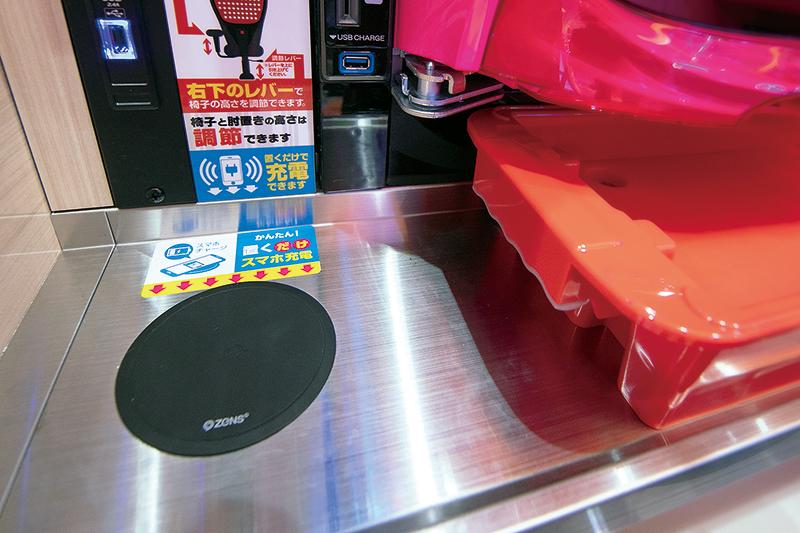 最新設備を備えた同店では、パチンコ全704台の膳板部分にスマホ用のワイヤレス充電器が導入されている。事前の設定もケーブルも不要で、スマホを載せるだけで充電が始まる。