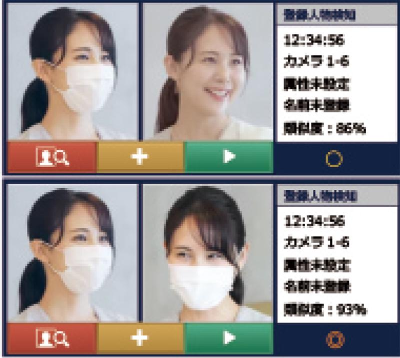 桒村 『EX‐Face』の認証エンジンが、マスクやサングラスなどの被覆物に惑わされることはありません。登録画像と検出画像にマスクあり・なしの違いがあっても、認証エンジンは最大10万人分の顔データから類似度が高い画像をピックアップ。同一人物である可能性が最も高い画像を類似度とともに表示します。実証実験ではマスク「あり・なし」の本人に対して、正しい登録画像を類似度80%以上として選出。マスク「あり・あり」、「なし・なし」の場合の類似度は90%以上でした。検出された人物と登録した人物が同一人物であるか、最終的には人の目で確認することを推奨しますが、十分に引けを取らない認証精度だと自負しております。