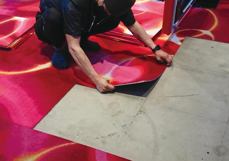 レストコーナーや景品カウンターまわりなどには、店のシンボルとなるようなロゴやキャラクター入りのほか、オリジナルデザインのカーペットを。その他の面積が広い部分には低価格でシンプルなパターン柄をという風に使い分け、全体的なコストを抑えることで要望に応えている。