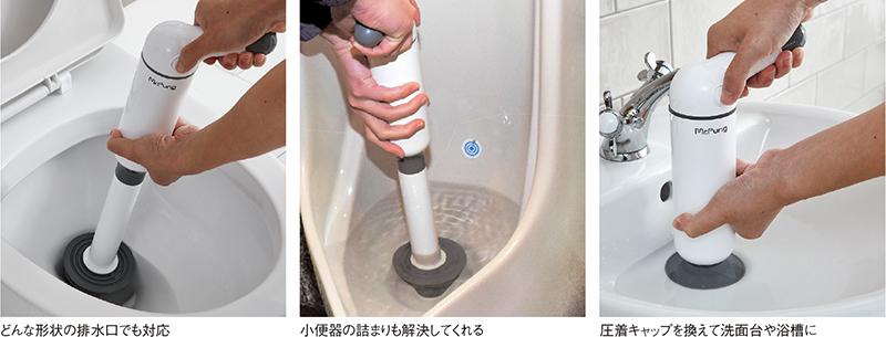 シリンダー内で圧縮された炭酸ガスが、排水管内で瞬間的に膨張して便器詰まりを解決する動画があるので、見てほしい。①は、洋便器の詰まり解決動画。ラバーカップ(ゴムのカップが付いた清掃道具)を使い、詰まりを解決しようと悪戦苦闘した経験のある人ならば、炭酸ガスの圧倒的なパワーに驚くはずだ。引くのではなく、押し込むので回りを汚さず、後始末に苦労することもない。