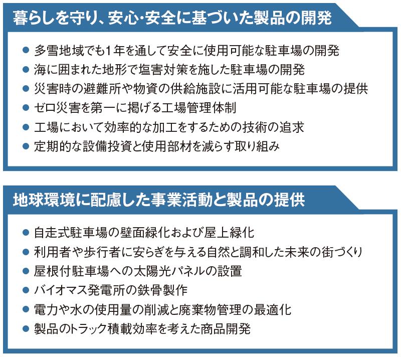 脱炭素社会の実現に向けては、自走式立体駐車場の壁面緑化や屋上緑化を通じてヒートアイランド現象の軽減を図るほか、屋根付駐車場に太陽光パネルを設置し、温室効果ガス排出量削減に寄与するなどの提案をしている。