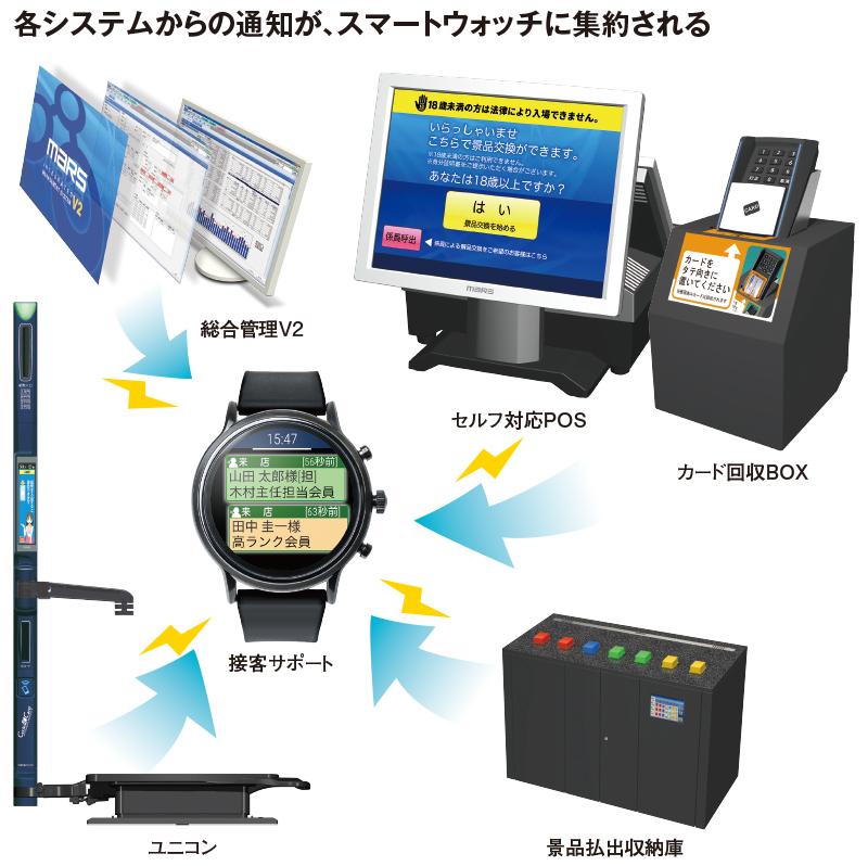 『セルフ交換対応POS』で人員数の最適化や最適配置が実現した場合、低コスト運営が図られる。しかし“人の目”が減ることで懸念されるのが、接客サービス品質の低下だ。遊技客の求めに迅速に応えられないのではないか。そんな不安は、『接客サポートシステムV2』やオプションの腕時計型ウェアラブル端末『マーススマートウォッチ』が解消してくれる。