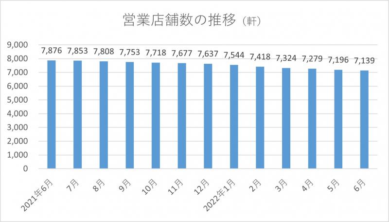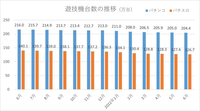 2022年07月21日No.10002960 全日遊連 加盟店舗数6月末の加盟営業店舗数は7139軒 全日本遊技事業協同組合連合会が集計した組合加盟店舗の実態調査によると、6月末時点の加盟営業店舗数は7139軒で、前月より57軒(0.8%)減少した。新規店舗数は5軒、廃業店舗数は58軒、当月中の休業店舗数は34軒。 6月末時点のパチンコ遊技機台数は204万4188台で、前月より5970台(0.3%)減少した。パチスロ遊技機台数は126万7059台で、同7081台(0.6%)減少。その他を含む遊技機総台数は331万1247台だった。