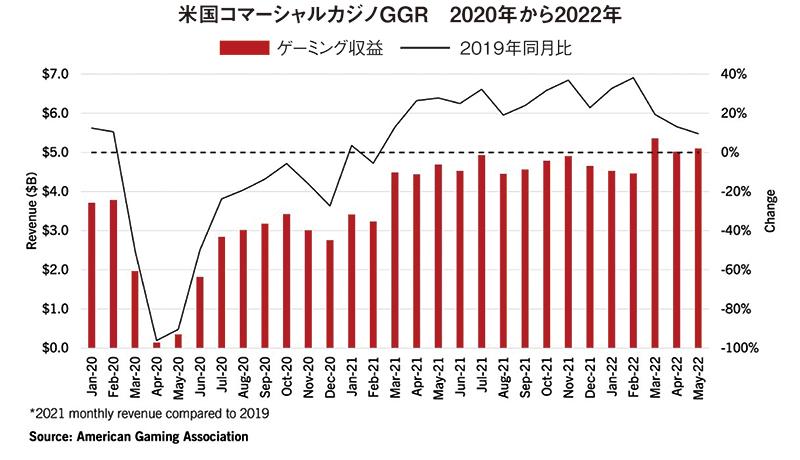 米国内ではサプライチェーンの問題、労働力不足、インフレなどの課題は続くものの、2022年の中盤に差しかかる5月までの直近3カ月間、コマーシャルカジノ業界は引き続き好調を維持している。5月単月のゲーミング収益(ランドベースカジノにスポーツベッティングとオンラインカジノを加えたもの)は前年同月を9.5%上回る$5.10billion(6954億円)で、5月としては過去最高を記録した。1月から5月までの5カ月間のゲーミング収益は、前年同時期を21.0%上回る$24.47billion(3兆3,367億円)で、通年でも前年を上回る可能性が見えてきた。