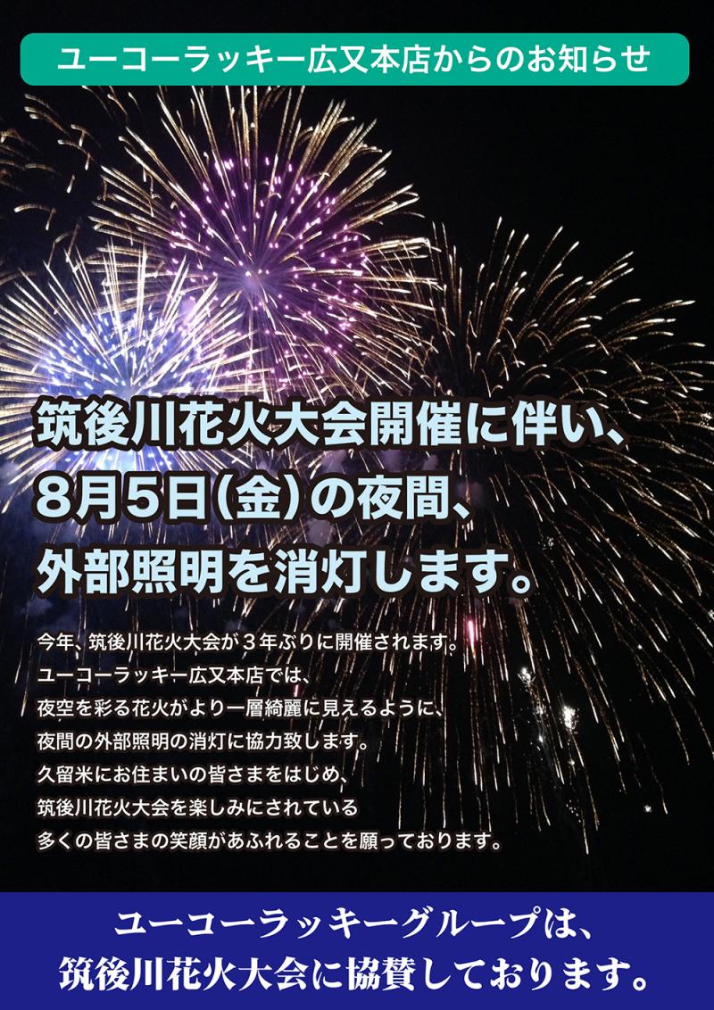 ユーコーラッキーグループはこの花火大会に企業として協賛。花火を打ち上げる筑後川河川敷からほど近い『ユーコーラッキー広又本店』では CSR活動の一環として、夜空を彩る花火が店舗近隣からでも見えやすくするため、夜間の外部照明の消灯に協力した。