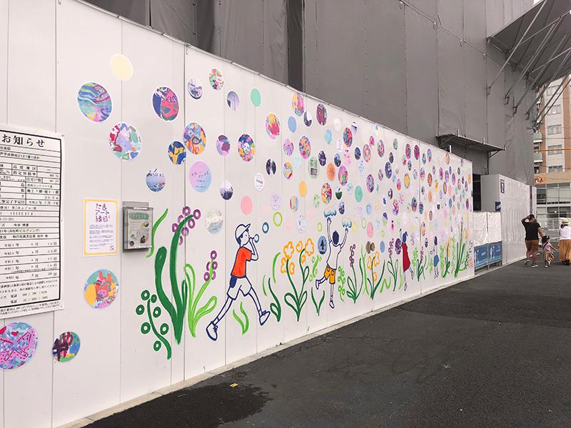 駅前の再開発が進行中の向ケ丘遊園北口駅前の複合商業施設建設現場の仮囲いに、大型のアートが描かれている。シャボン玉を追いかける子どもたちの絵は、近くで見るとシャボン玉それぞれに絵が描かれている。これは7月23日にこの近くの空き地で開催されたアートイベントで、参加者が「みんなの景色」をテーマに丸型の画用紙に思い思いに描き、この仮囲いに設置されたもの。