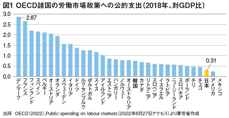 岸田政権の看板政策「新しい資本主義」では、「人への投資」の抜本強化を重点の1つとして掲げており、3年間で4000億円規模の施策パッケージを新たに創設するとしている。実は日本は、労働市場政策への公的支出のGDP比が、OECD諸国の中で非常に低い水準にある(下図)。日本社会はこれまで長期雇用が前提で、能力開発を企業内教育や企業内訓練に頼ってきたため、職業訓練やリカレント教育(社会に出た後も、それぞれの人の必要なタイミングで再び教育を受け、仕事と教育を繰り返すこと)に対し公的な支援の必要性があまり求められてこなかった。だが日本的雇用慣行が崩れていく中で就職後の能力開発を企業任せにするのには限界があるため、「労働政策として国が予算をかけて取り組むべき」というのが岸田政権の考えだ。