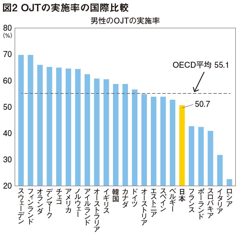 厚労省が、Manpower Group「Talent Shortage Survey(2014)」を用いて、「ある業務を遂行するに当たって、従業員の能力不足に直面している企業」の割合について国際的な状況を整理した。その結果、日本は従業員の能力不足に直面している企業の割合が81%で、2位のインド(64・0%)、3位のブラジル(63・0%)を大きく上回り、OECD諸国の中で最も高い水準だった。それにもかかわらず、企業のOJTの実施率は男女ともにOECD平均を下回っている(図2)。