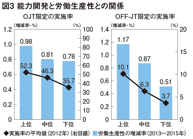 能力開発の実施と労働生産性の向上の関係はすでに明白だ。OECDの「国際成人力調査」では、2012年の各国のOJT参加者率やOFF‐JT参加者率と、その翌年以降3年間の各国の労働生産性の変動を比較した。結果は、いずれの能力開発においても実施率が高い上位の区分にある国の方が、労働生産性の上昇率が高い傾向にあった(図3)。
