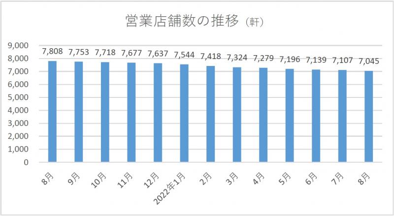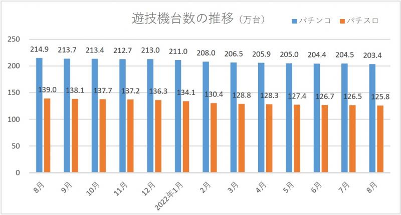 2022年10月06日No.10003075 全日遊連 加盟店舗数8月末の加盟営業店舗数は7045軒 全日本遊技事業協同組合連合会が集計した組合加盟店舗の実態調査によると、8月末時点の加盟営業店舗数は7045軒で、前月より62軒(0.9%)減少した。新規店舗数は3軒、廃業店舗数は88軒、当月中の休業店舗数は24軒。 8月末時点のパチンコ遊技機台数は203万4415台で、前月より1万238台(0.5%)減少した。パチスロ遊技機台数は125万7952台で、同7478台(0.6%)減少。遊技機総台数は329万2367台だった。
