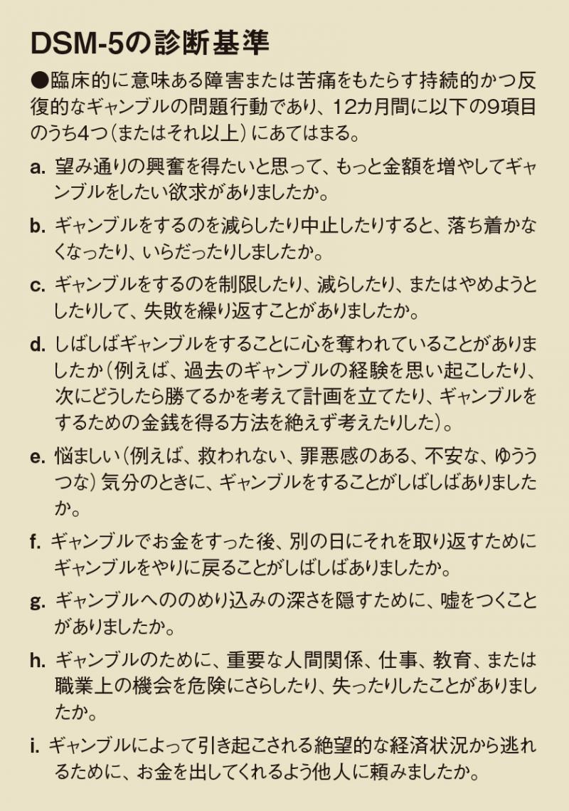 篠原 我々にとって驚きのトピックは、ギャンブリング障害(Gambling disorder)の診断要件の記述が詳細化され、必須要件が厳格化されたことです。簡単にはギャンブリング障害と診断されない、ということです。ここまで詳細記述されると予想していた人はほとんどいなかったと思います。具体的には、①ギャンブリング行動のコントロール障害、②ギャンブリングの最優先、③否定的な結果にもかかわらず継続拡大、の3つの要件「すべて」に当てはまり、なおかつ、「そのギャンブリング行動のパターンにより、個人、家族、社会、教育、職業またはその他の重要な機能分野において顕著な苦痛または障害が生じている」こと。そういう状態が12カ月にわたって認められ、かつ他の疾病や障害では説明できないことが、ギャンブリング障害と診断するのに必須であると書かれているのです。