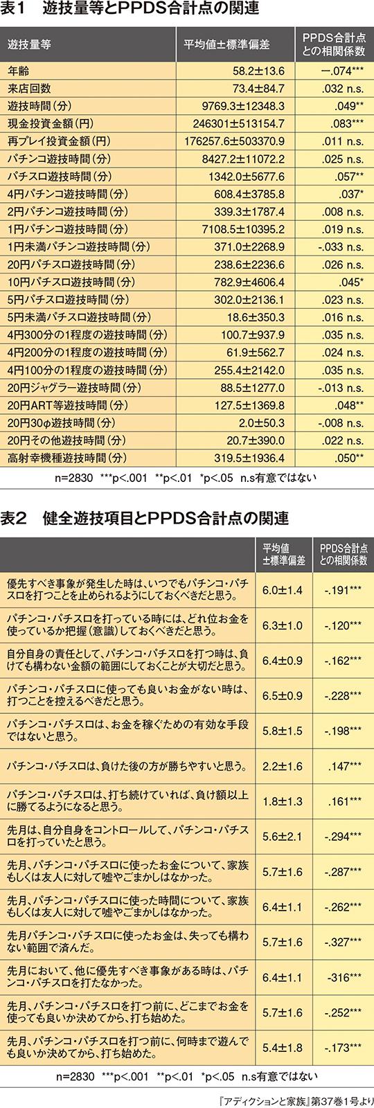 調査結果では、遊技時間、現金投資額とPPDS合計点には有意な相関が認められたものの、相関係数は0.1以下と極めて小さいことがわかった(表1)。つまり、ほぼ影響していないと考えられる。