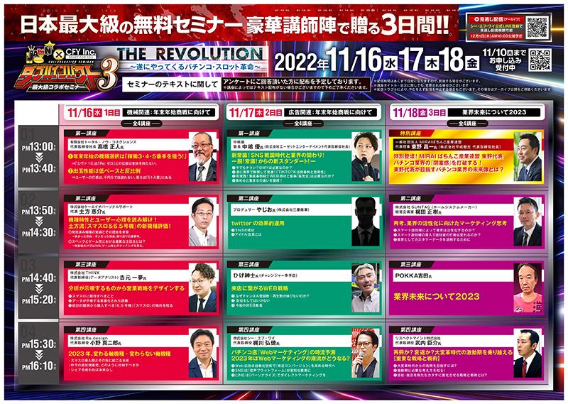 JAPaNセミナーとシー・エフ・ワイが主催する、業界最大級の無料セミナー「JAPaN×CFY ダブルインパクト3 THE REVOLUTION~遂にやってくるパチンコ・スロット革命~」が11月16日から18日まで開催される。