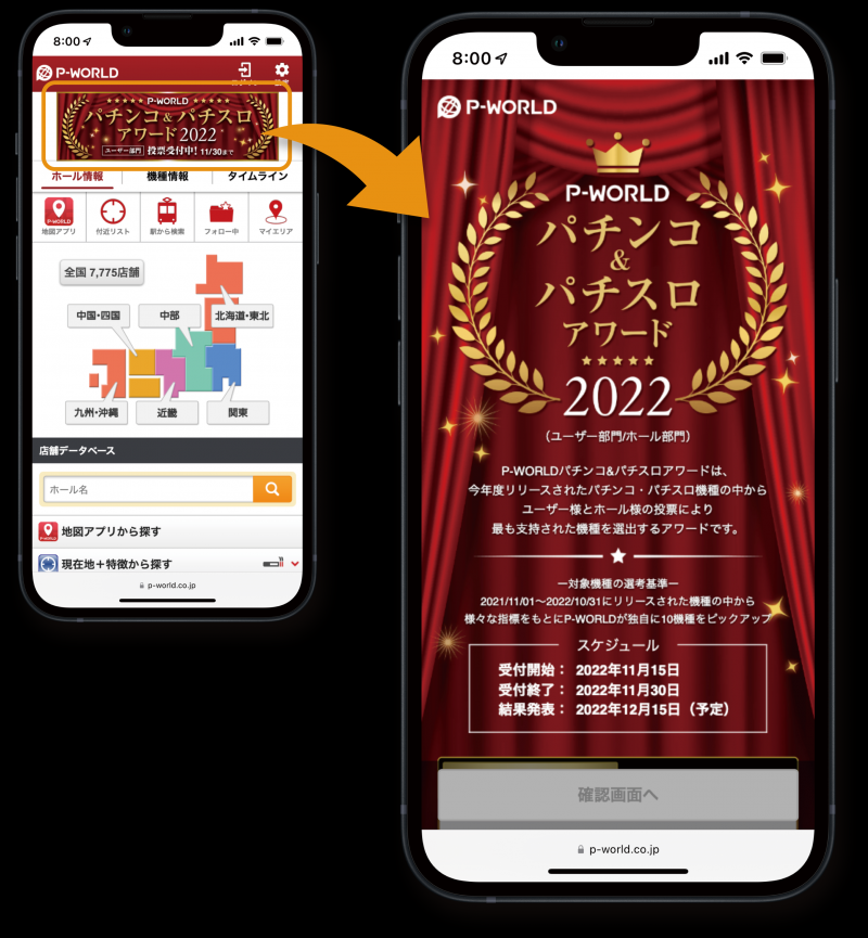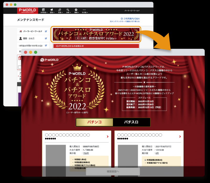 ユーザー部門は、P-WORLDトップページや機種トップページに設置されたバナーから特設ページへアクセスすることで投票可能。ホール部門はメンテナンスページに用意された入り口から特設ページにアクセスすることで投票が可能になる。投票期間はともに11月15日から30日まで。投票結果は12月15日に発表される予定だ。
