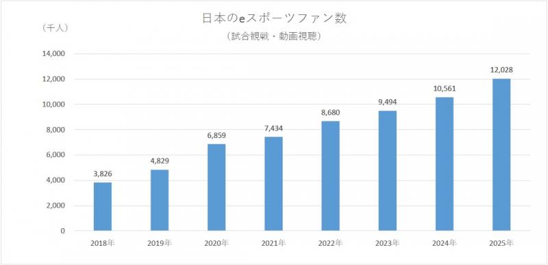 試合を観戦したり動画を視聴する日本のeスポーツファン数は、743万人だった。前年比8.4%増。25年には1200万人を超えると見込まれている。