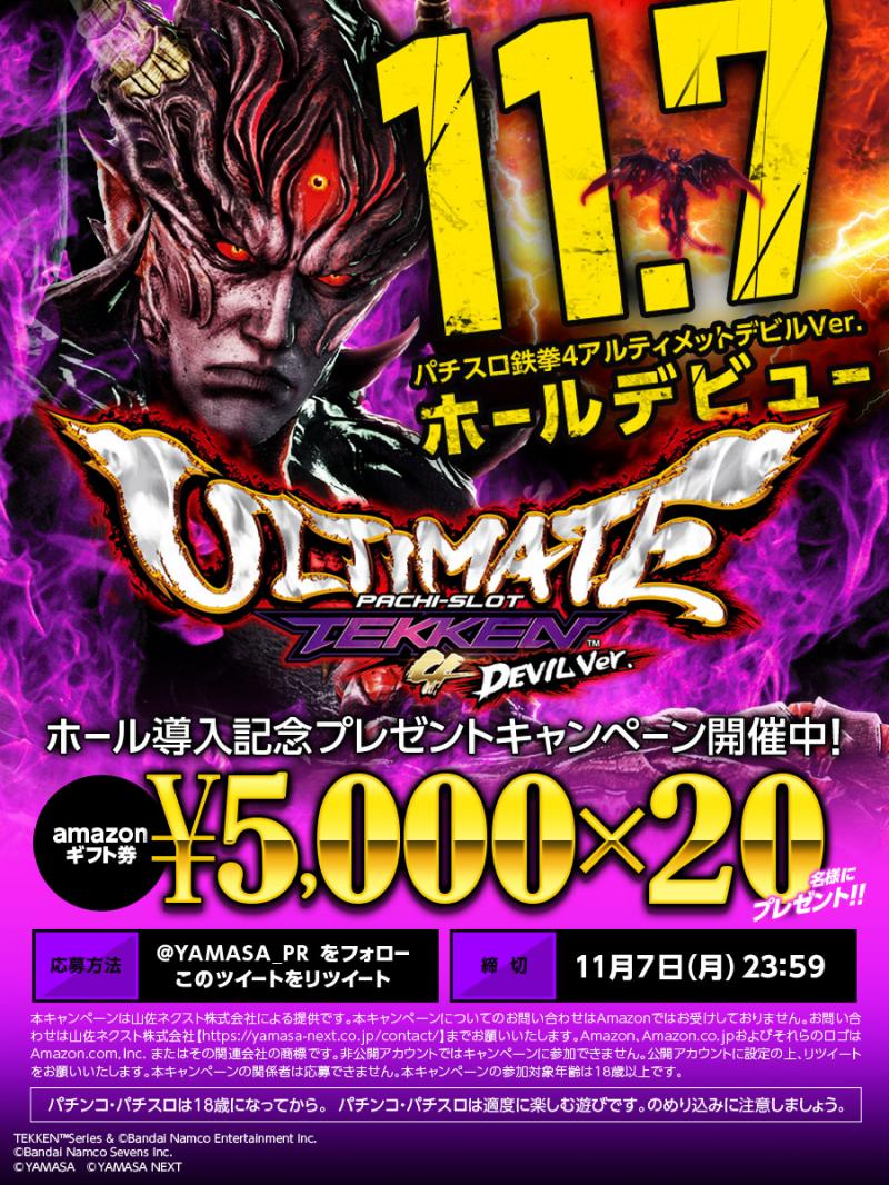 山佐は11月1日から7日までの7日間、新機種『パチスロ鉄拳4アルティメットデビルVer.』の導入を記念して、フォロー&RTキャンペーンを実施している。